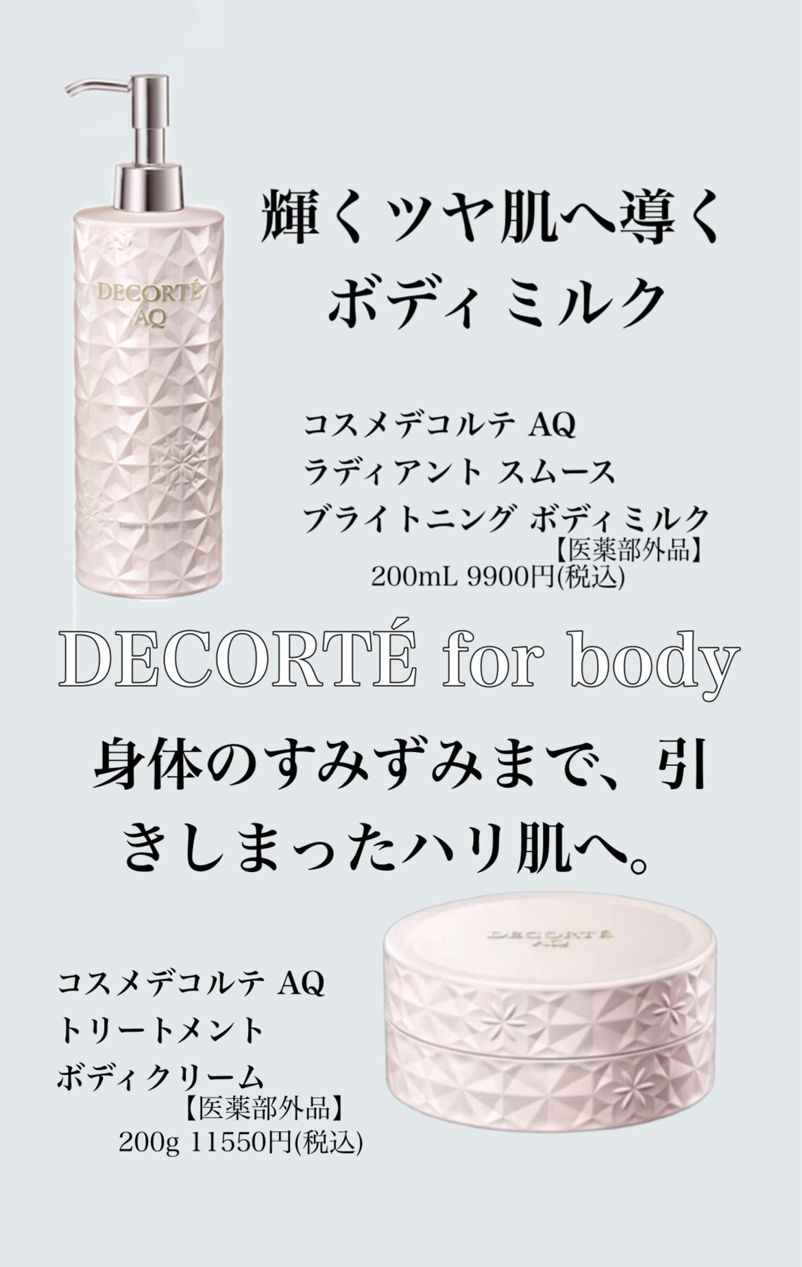 美白・肌アレケアをしながら、一日中うるおいで全身を包み込み輝くツヤ肌へ導くボディミルク。